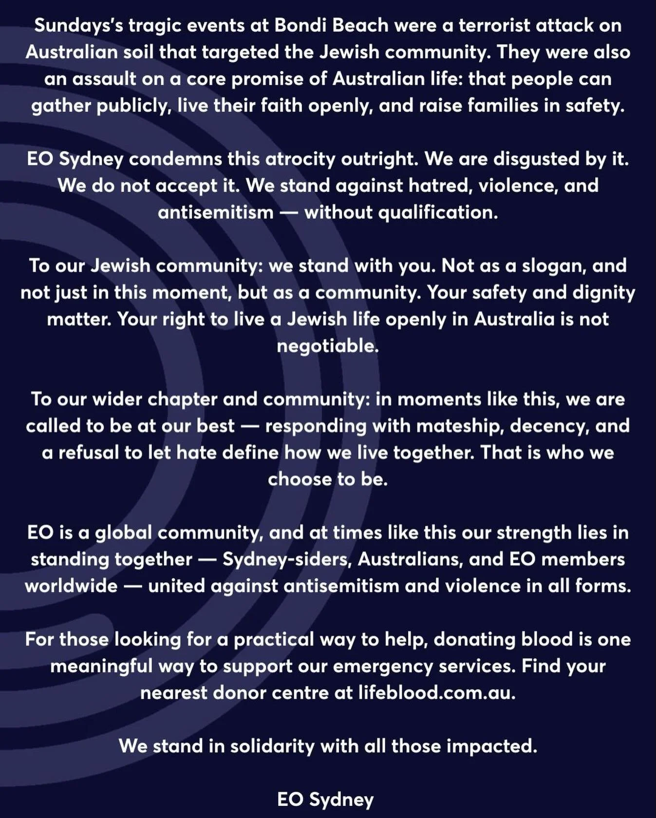 EO is a global business network of 19,000 plus influential business owners in over 213 chapters across 80 countries and the Sydney chapter has over 190 members. Australia is also home to chapters in Adelaide, Melbourne, Perth and Queensland.